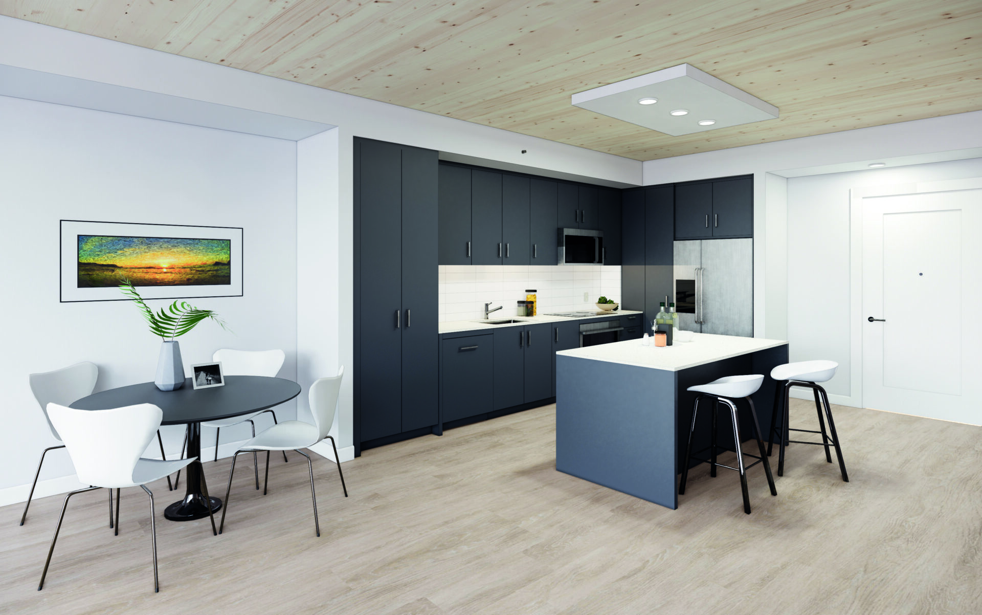 The project used Mercer Mass Timber’s cross-laminated timber (CLT) for five of the seven stories, totaling nearly 230,000-square-feet. The CLT used included both 5-ply and 7-ply and was exposed on the ceilings inside the units.